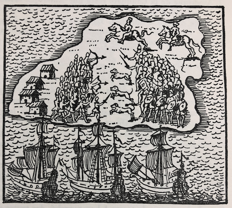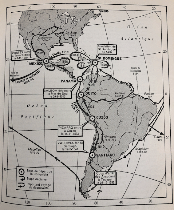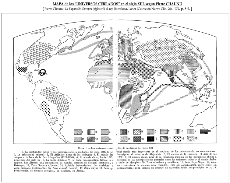 El conocimiento de los dos volúmenes de Pierre Chaunu sobre los que basaré este trabajo ha sido un acontecimiento gratísimo por inesperado y útil. Debo su conocimiento a Engelbert Magriñá aunque también los dos tomos de Chaunu venían recomendados en el libro de Tvetan Todorov, donde también se recomedaba el librito de J. H. Elliott manejado por Josep Solà y por mí. Recomendados por estos compañeros, el estudio de estos libros ha puesto en evidencia mi ignorancia, así como la necesidad de hacer un repaso global de la época antes de entrar en la cuestión moral en torno al "encuentro" y al "desencuentro" entre hombres de tan diferentes culturas. Para ello, además del libro de Todorov he contado con los ensayos de Rafael Sánchez Ferlosio...
